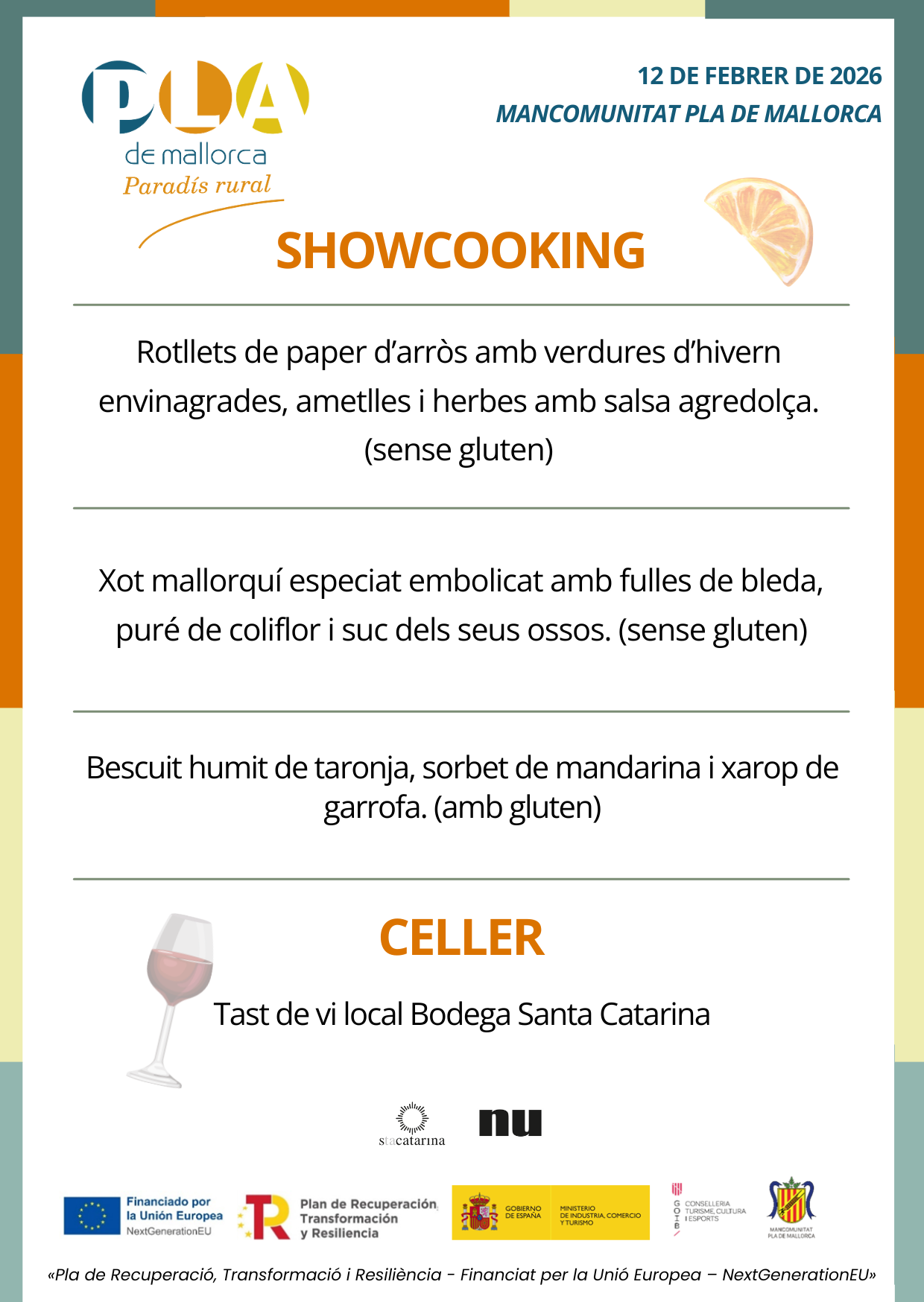 Les jornades s’emmarquen dins el desenvolupament del Pla de Promoció de Productes Gastronòmics amb enfocament turístic al Pla de Mallorca. L’actuació ha estat finançada íntegrament amb fons europeus en el marc del Pla de Sostenibilitat Turística en Destí (PSTD) Pla de Mallorca 2021, dins el Pla de Recuperació, Transformació i Resiliència – Next Generation EU.
