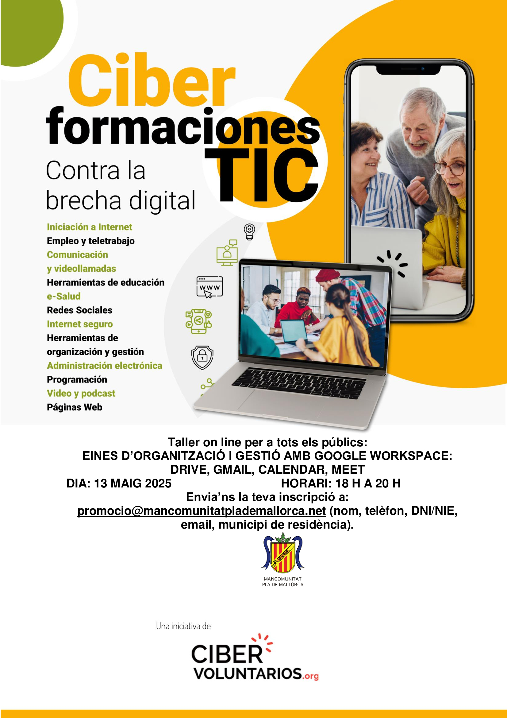 🔸 Eines d'organització i gestió amb Google Workspace: Drive, gmail, calendar, meet. 13 de maig, de 18 a 20 h.
