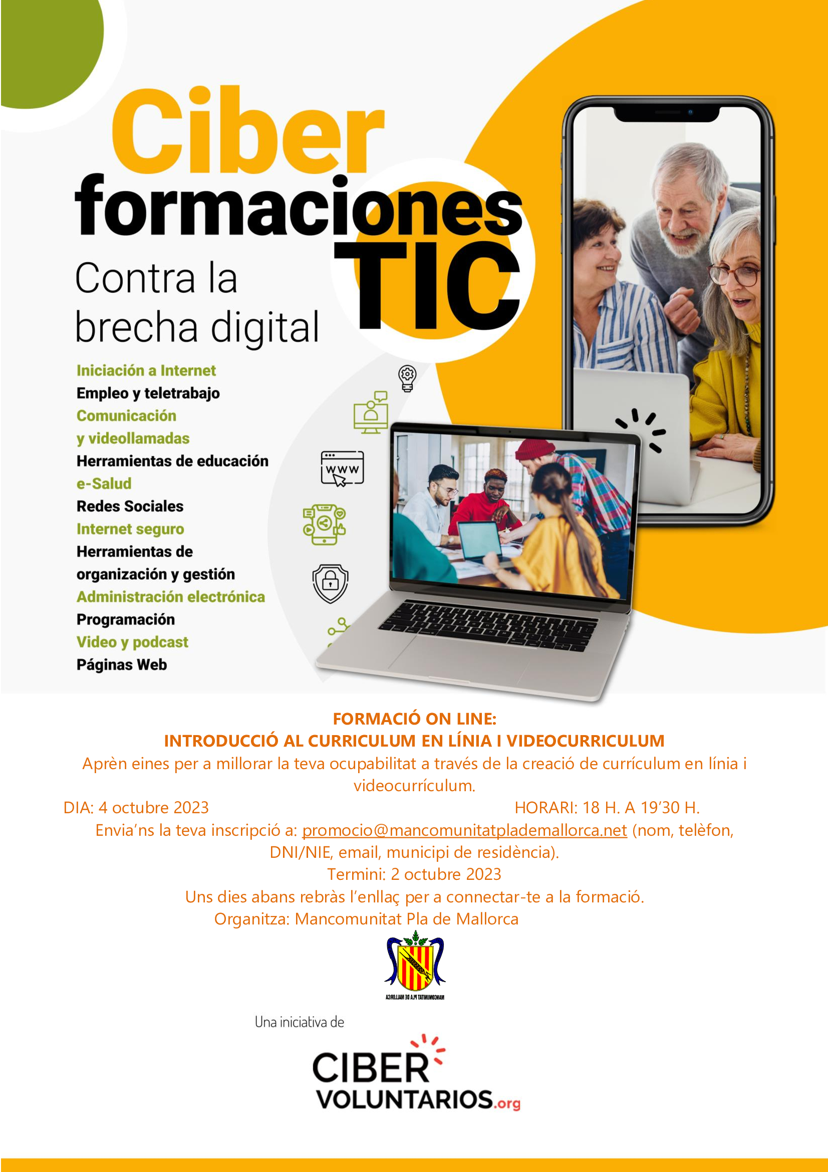 Inscripció: Envia'ns un correu a promocio@mancomunitatplademallorca amb: Nom del curs, Nom i llinatges,DNI/NIE, telèfon, e-mail, municipi de residència.