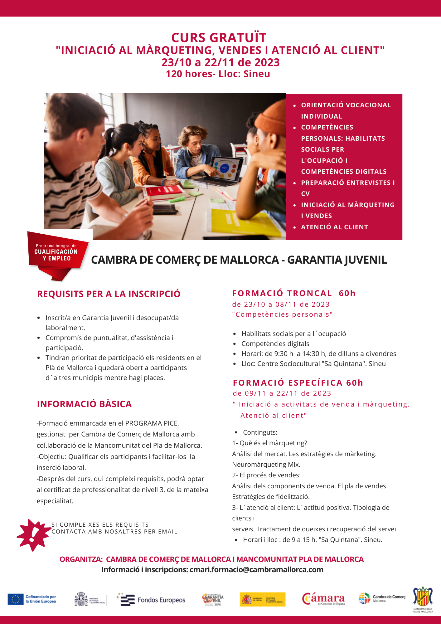 Aquí teniu l'enllaç per a la inscripció:https://www.cambramallorca.com/noticias-agenda/14526/garantia-juvenil-iniciacion-al-marketing-ventas-y-atencion-al-cliente