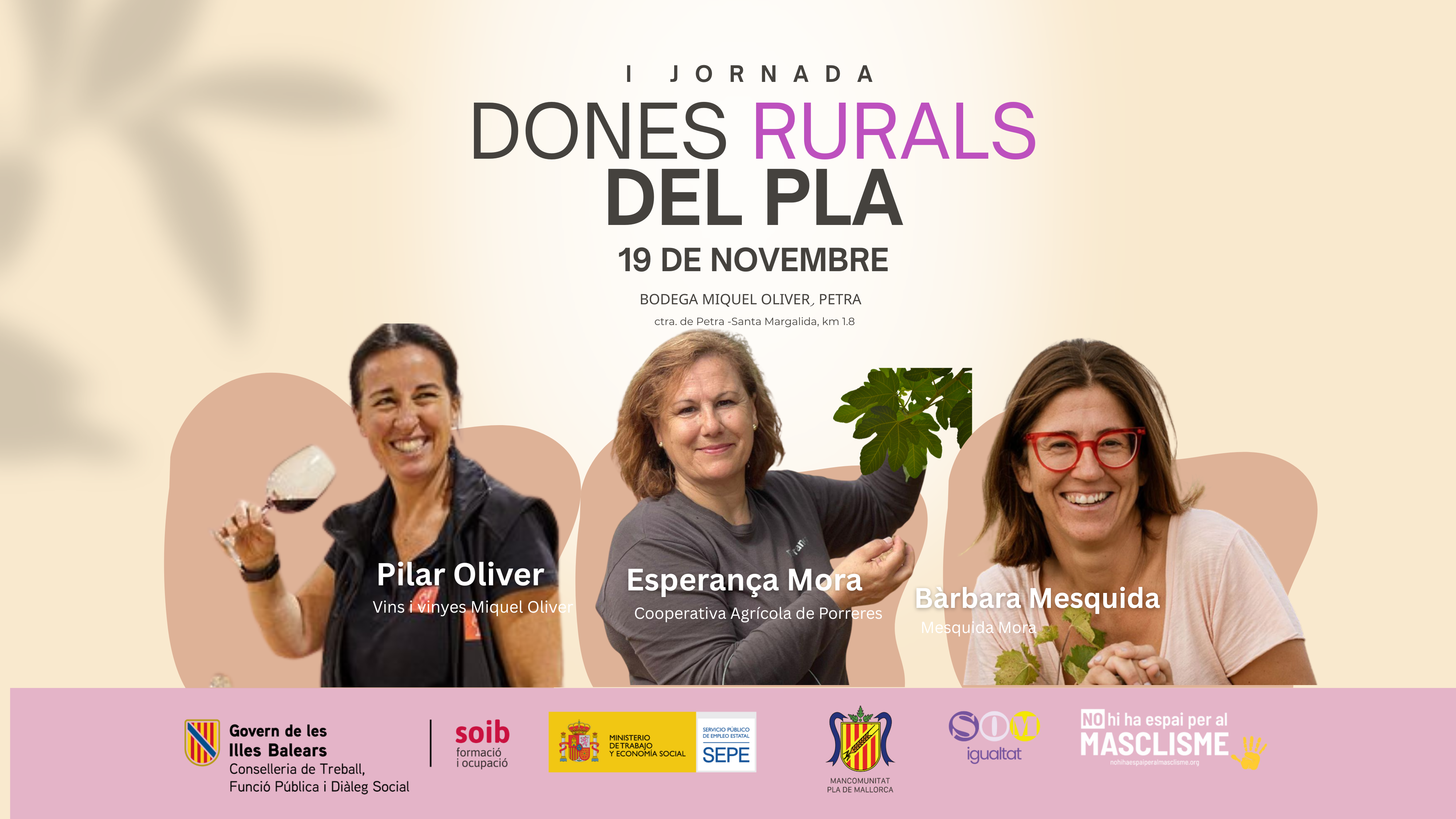 Els departaments d'Igualtat i Promoció Ecocòmica de la Mancomunitat del Pla de Mallorca organitzen conjuntament la I Jornada Dones Rural del Pla, una trobada destinada a posar en valor les dones que treballen al sector primari del Pla de Mallorca i a reflexionar sobre els reptes que han afrontat en feines tradicionalment masculines.