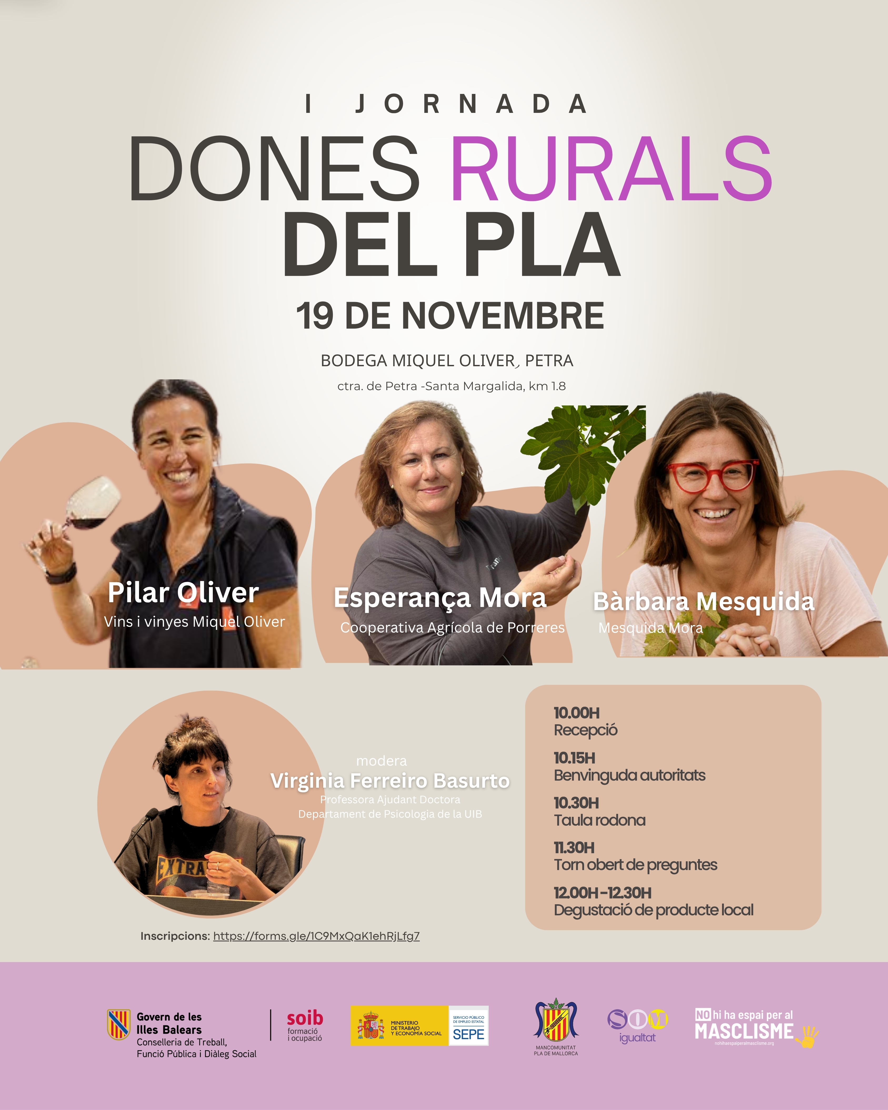 La jornada serà moderada per Virginia Ferreiro Basurto, Professora ajudant doctora del Departament de Psicologia de la UIB, i comptarà amb les següents ponents del sector primari del Pla: Pilar Oliver, de Vins i Vinyes Miquel Oliver, Esperança Mora, de la Cooperativa Agrícola de Porreres i Bàrbara Mesquida, de Vins Mesquida Mora