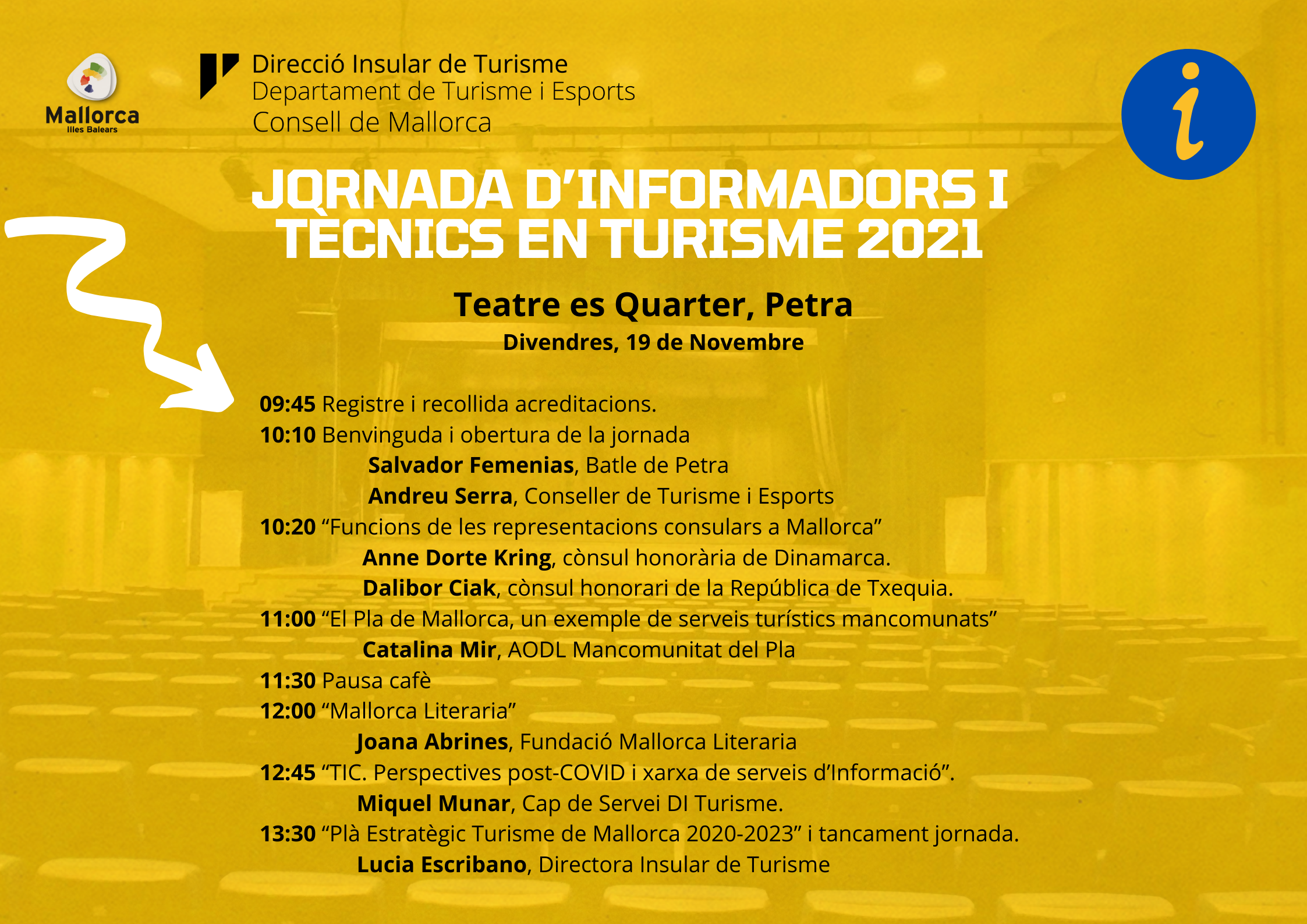 Dia 19 de Novembre tindrà lloc la "Jornada Informadors i Tècnics en Turisme 2021" al Teatre de Petra on la AODL de la Mancomunitat, Catalina Mir, exposarà "El Pla de Mallorca, un exemple de serveis turístics mancomunats".