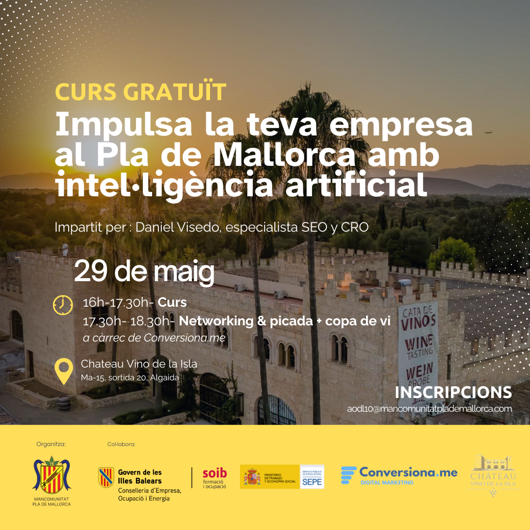 La sessió tindrà lloc a partir de les 16.00h a la bodega Chateau Vino de la Isla, situada a la carretera Ma-15 (Sortida 20), al municipi d’Algaida. El curs serà impartit per Daniel Visedo, especialista en SEO i CRO de l’empresa Conversiona.me.