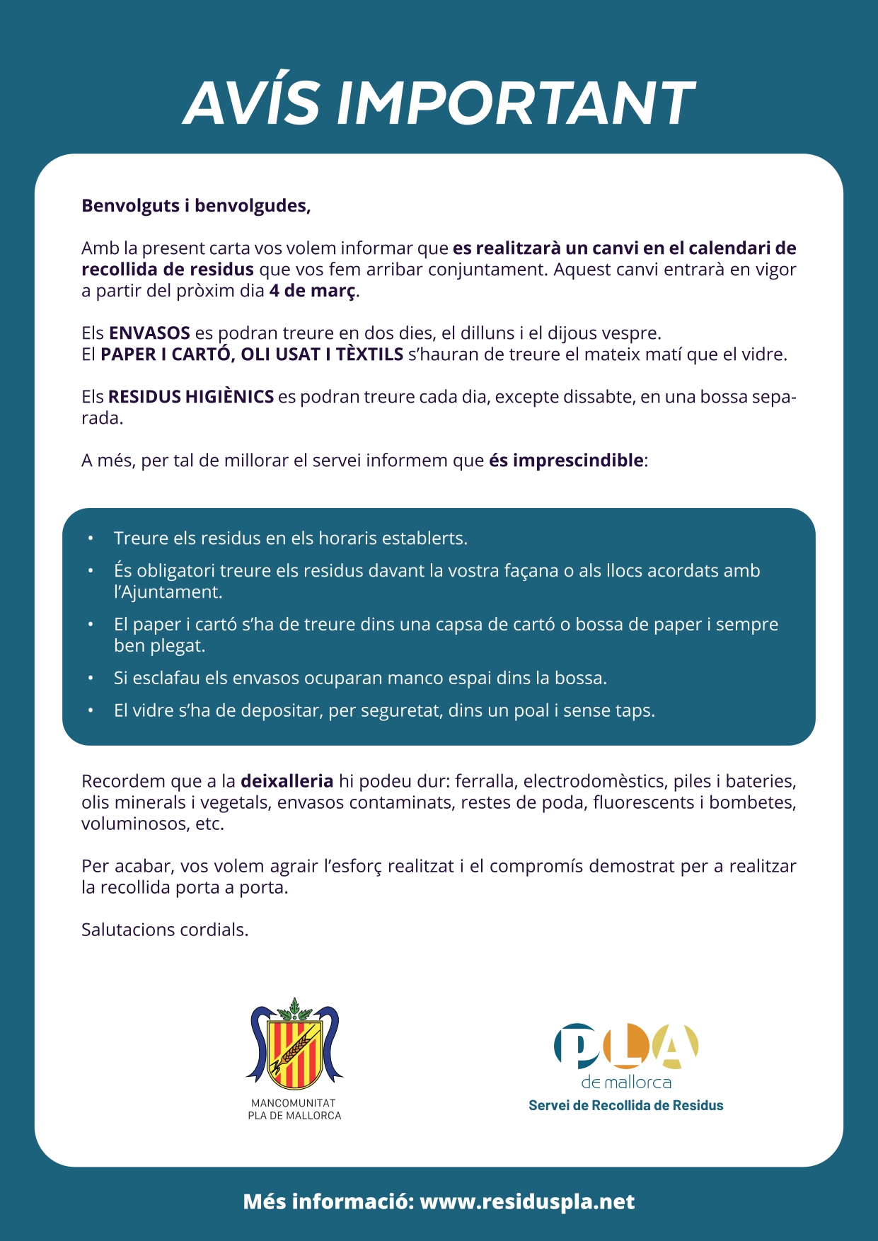 La mancomunitat posa en marxa, a partir de dia 4 de març, els nous serveis de recollida de residus als catorze municipis del Pla de Mallorca