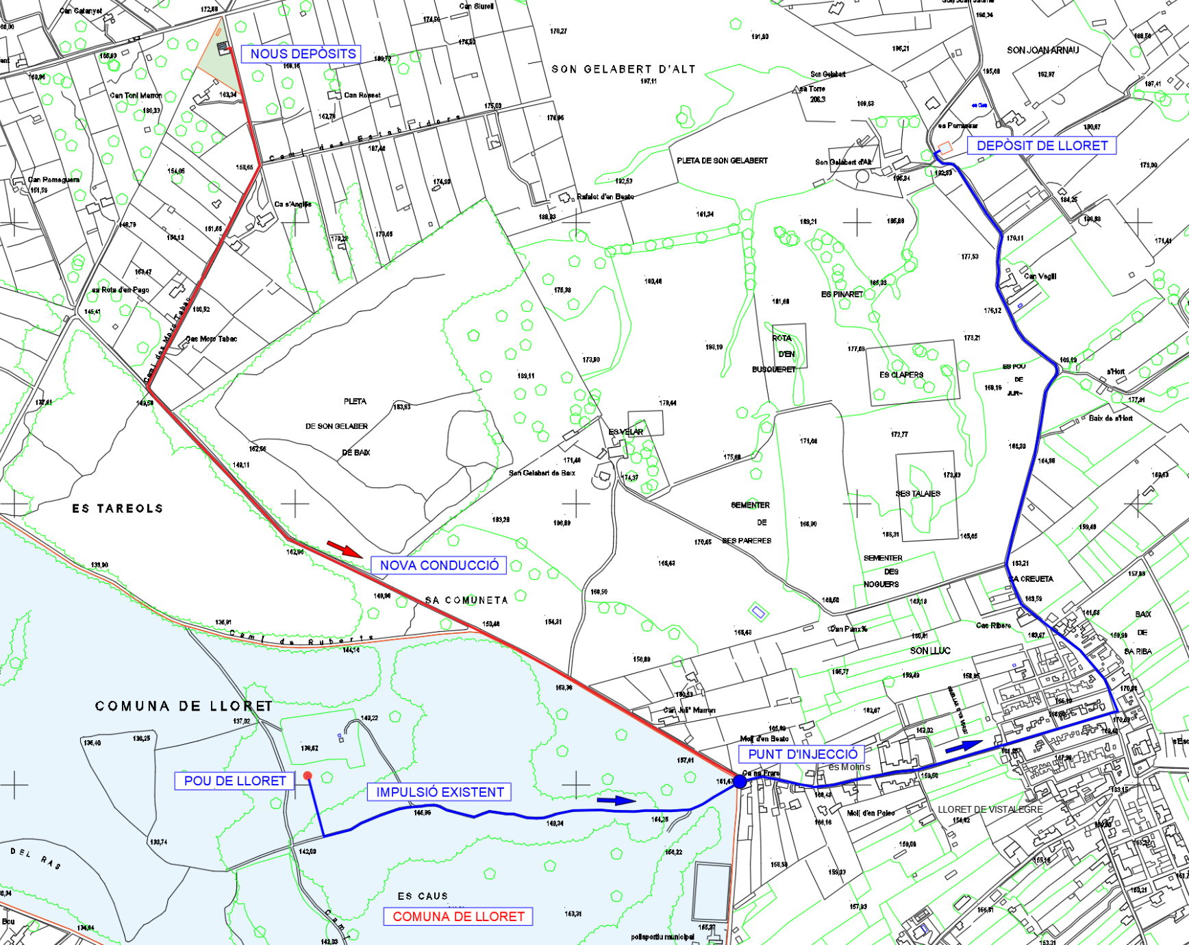 El primer projecte, per un import de 488.848,79 euros, consisteix amb poder portar aigua des del dipòsit de Ruberts fins a Lloret mitjançant la construcció d’uns dipòsits de doble cos amb una capacitat total de 100 m³ a la parcel·la on ja existeix un depòsit que subministra aigua a una part del municipi, situat a la carretera de Sineu; construir un grup de bombeig en aquesta parcel·la per bombejar l'aigua des d'aquests dipòsits nous fins a un punt determinat, en concret al camp de futbol de Lloret, que és per on passa la impulsió del pou municipal. L'opció que es planteja seria que les bombes d'impulsió es posarien en marxa alhora que el pou de la Comuna, perquè l'aigua arribés barrejada al dipòsit actual de Lloret.