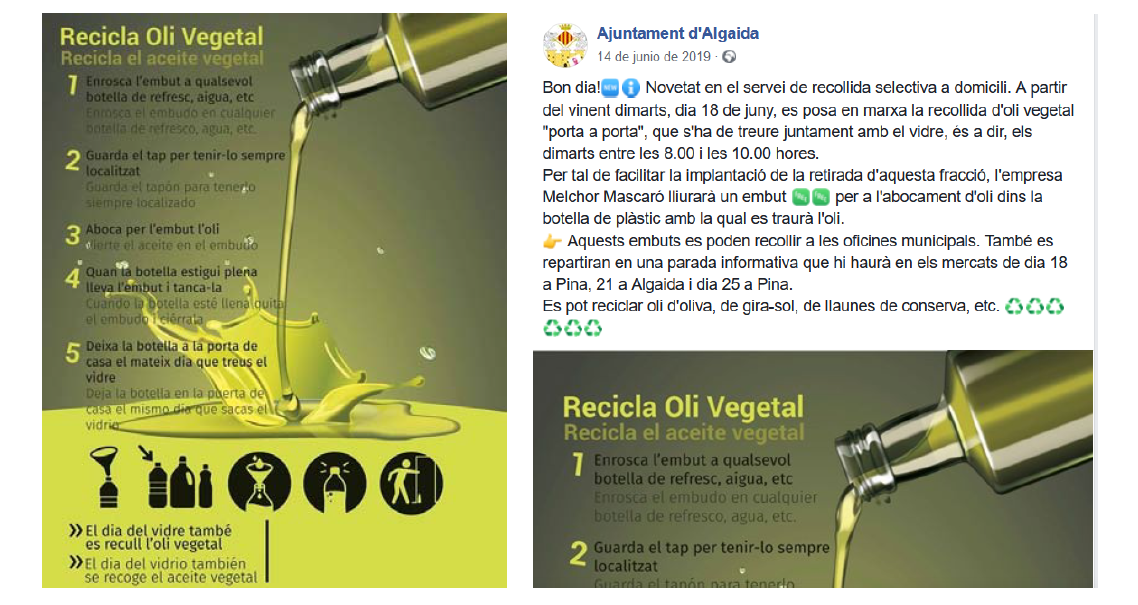 LA RECOLLIDA DE L'OLI DOMÈSTIC PORTA A PORTA COM A EXEMPLE D'INICIATIVA SOSTENIBLE PER ECOVIDRIO.
