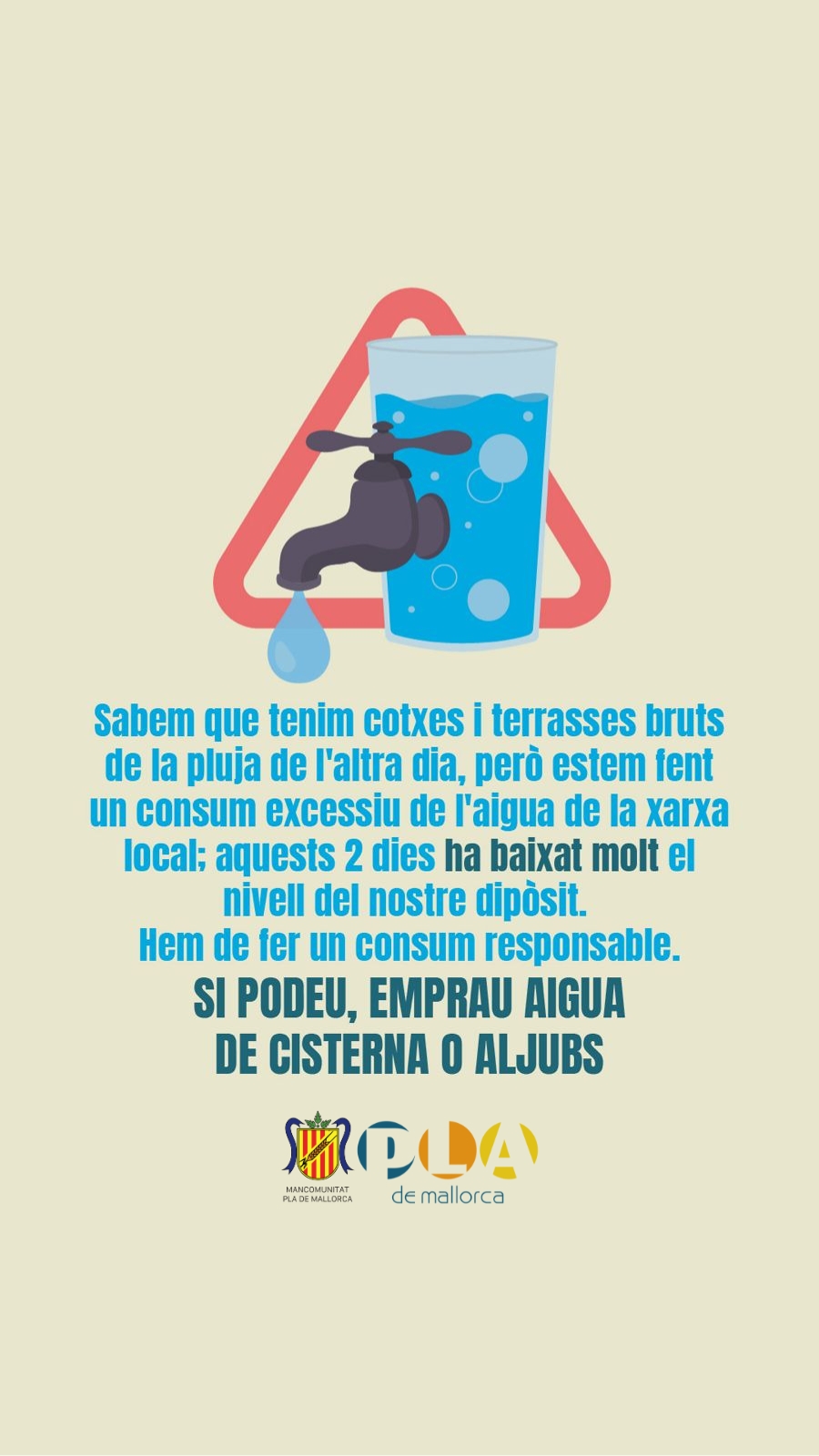 La Mancomunitat, juntament amb els ajuntaments del Pla, fa una crida per fer un ús correcte de l'aigua que és de tots i totes. A causa de les recents plogudes de terra, aquests dos darrers dies s'ha fet un ús excessiu d'aigua i els dipòsits han baixat molt.