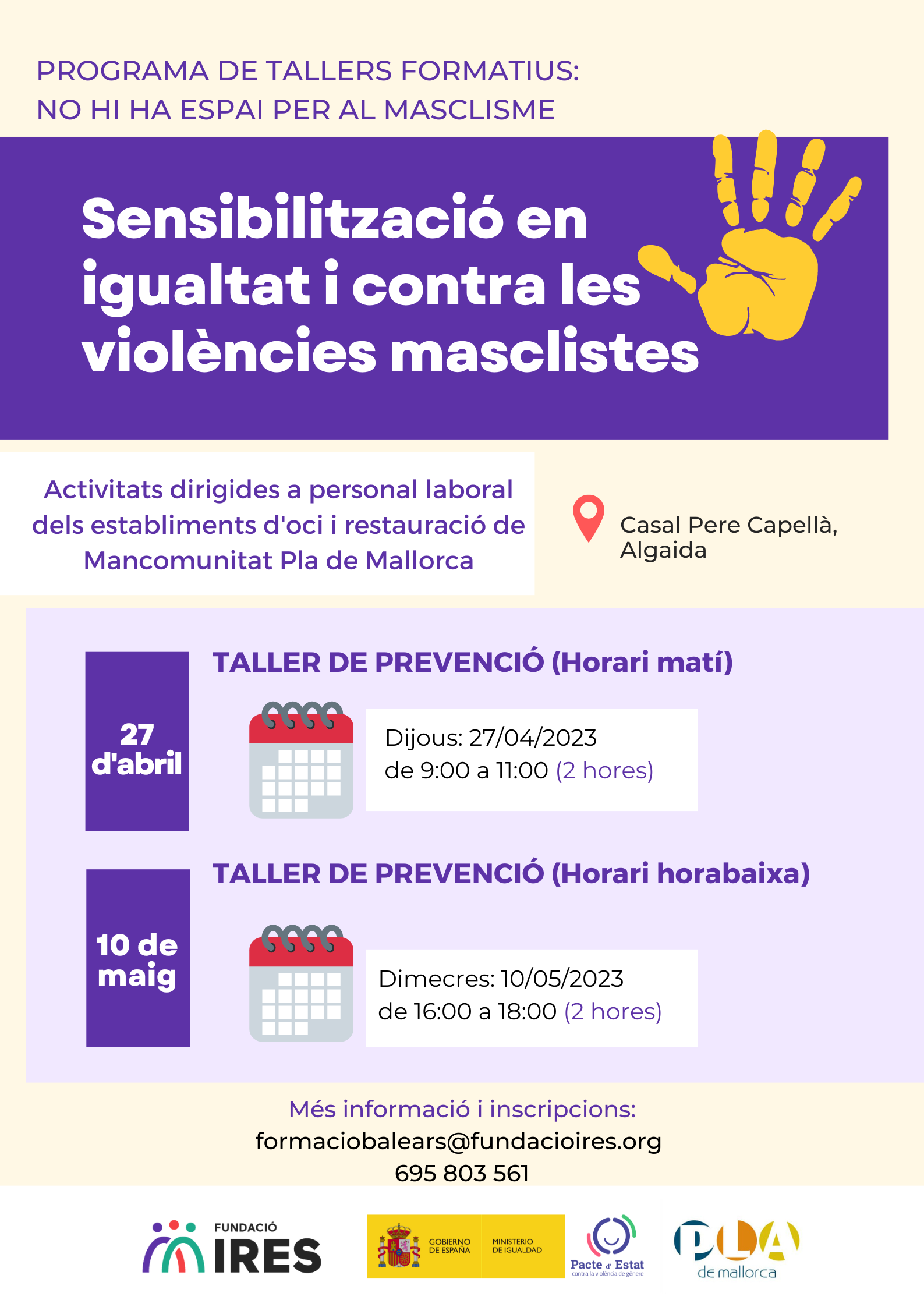En principi oferim tres tallers, dijous 27 d’abril de 9 a 11 h i dimecres 10 de maig de 16 a 18 h al Casal Pere Capellà d’Algaida i dijous 18 de maig de 10 a 12 h a la sala de formacions de Serveis socials de Porreres
