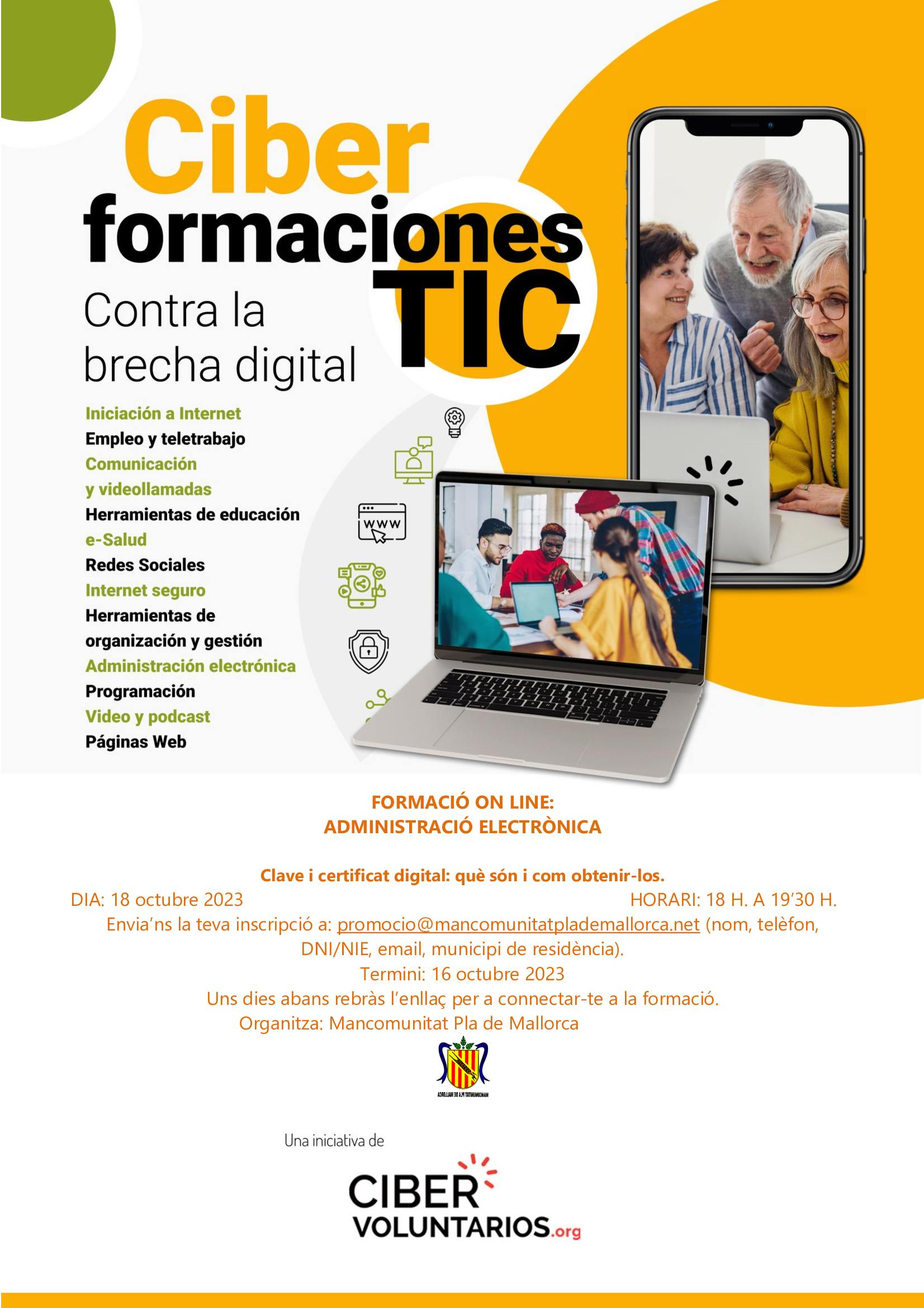 Inscripció: Envia'ns un correu a promocio@mancomunitatplademallorca amb: Nom del curs, Nom i llinatges,DNI/NIE, telèfon, e-mail, municipi de residència.